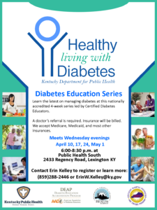 Healthy Living with Diabetes Calendar Add to Calendar Add to Timely Calendar Add to Google Add to Outlook Add to Apple Calendar Add to other calendar Export to XML When: 04/10/2019 @ 6:00 pm – 8:30 pm America/New York Timezone Repeats 2019-04-10T18:00:00-04:00 2019-04-10T20:30:00-04:00 Where: Public Health South 2433 Regency Rd Lexington, KY 40503 USA Cost: Free Contact: Erin Kelley 859-288-2446 Email